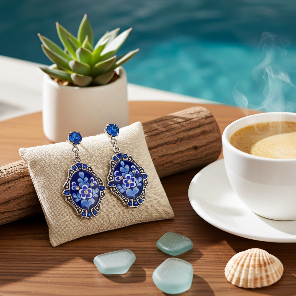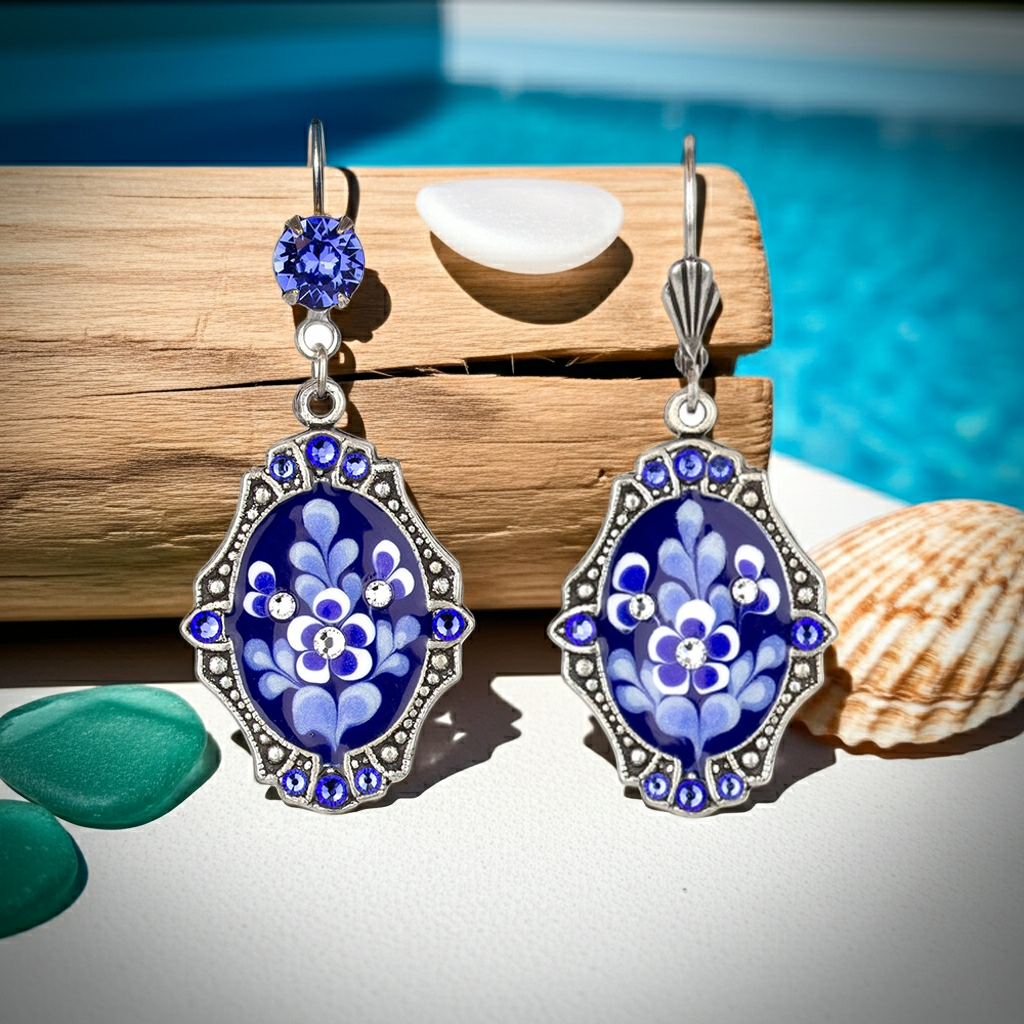 These crest shaped earrings with beaded edges and scallop details feature blue and white flowers on a rich indigo background, with crystal accents.