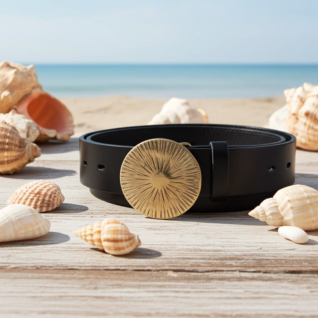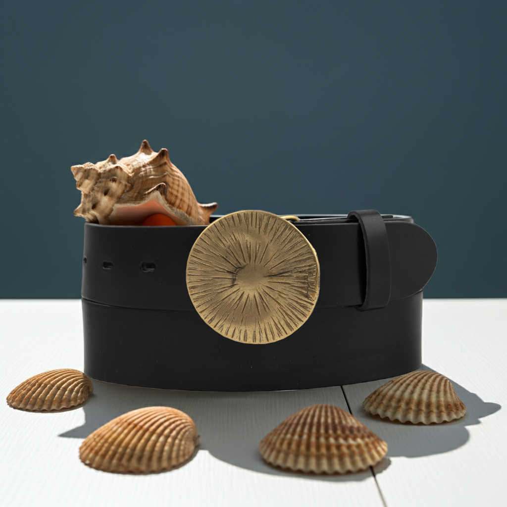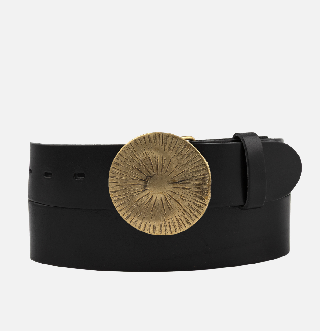 Made from premium leather, the strap features a warm, smooth finish that pairs beautifully with the bold, sunburst-etched brass buckle.