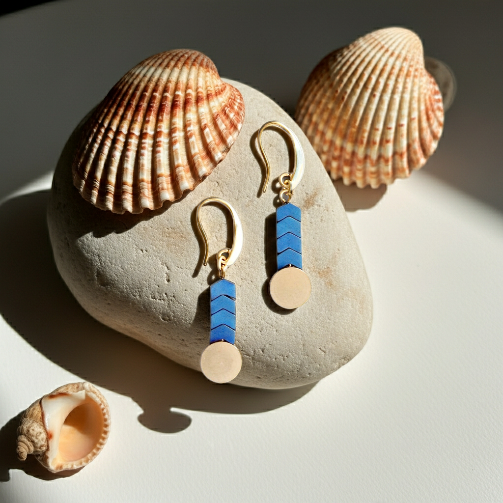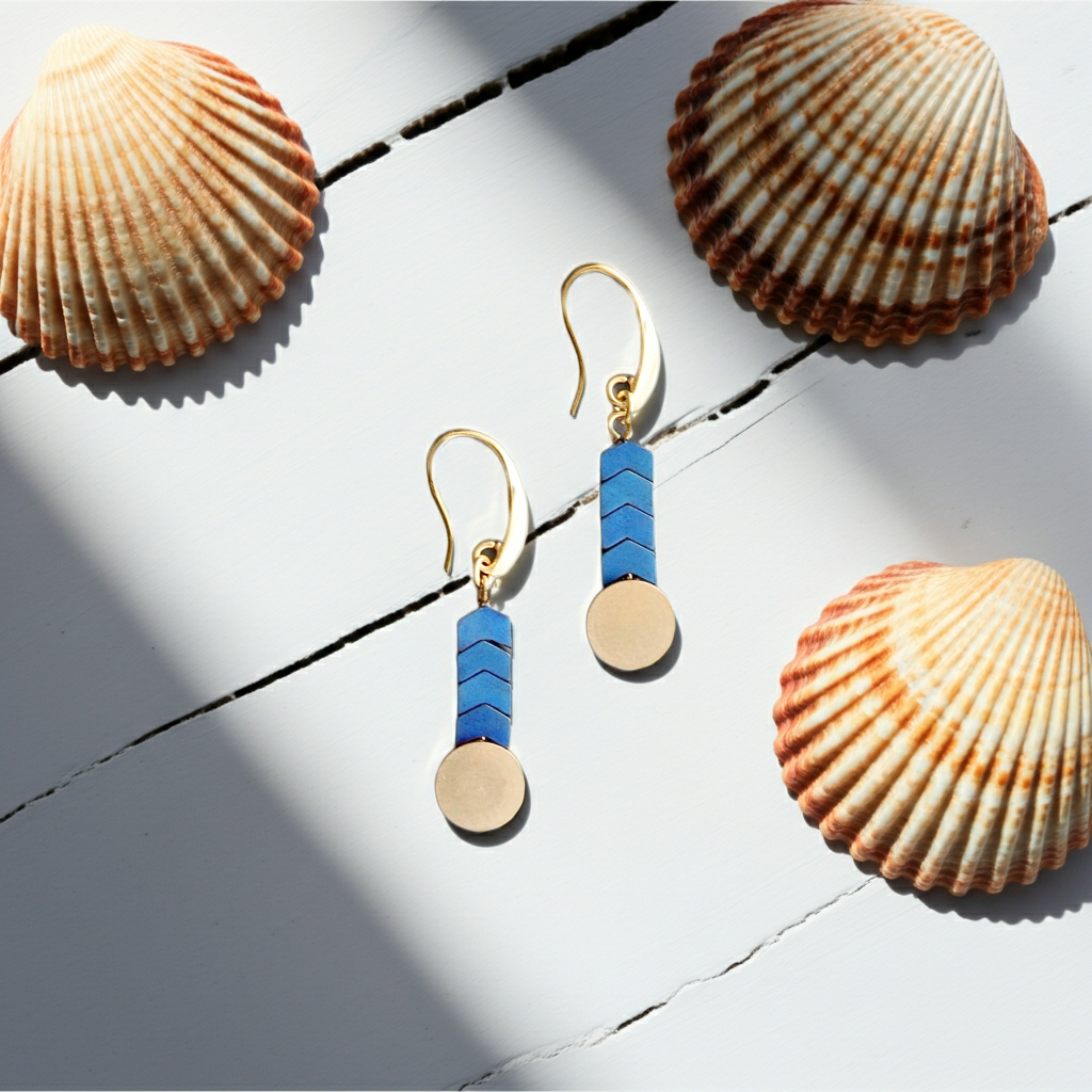 Blue hematite and brass disc earrings