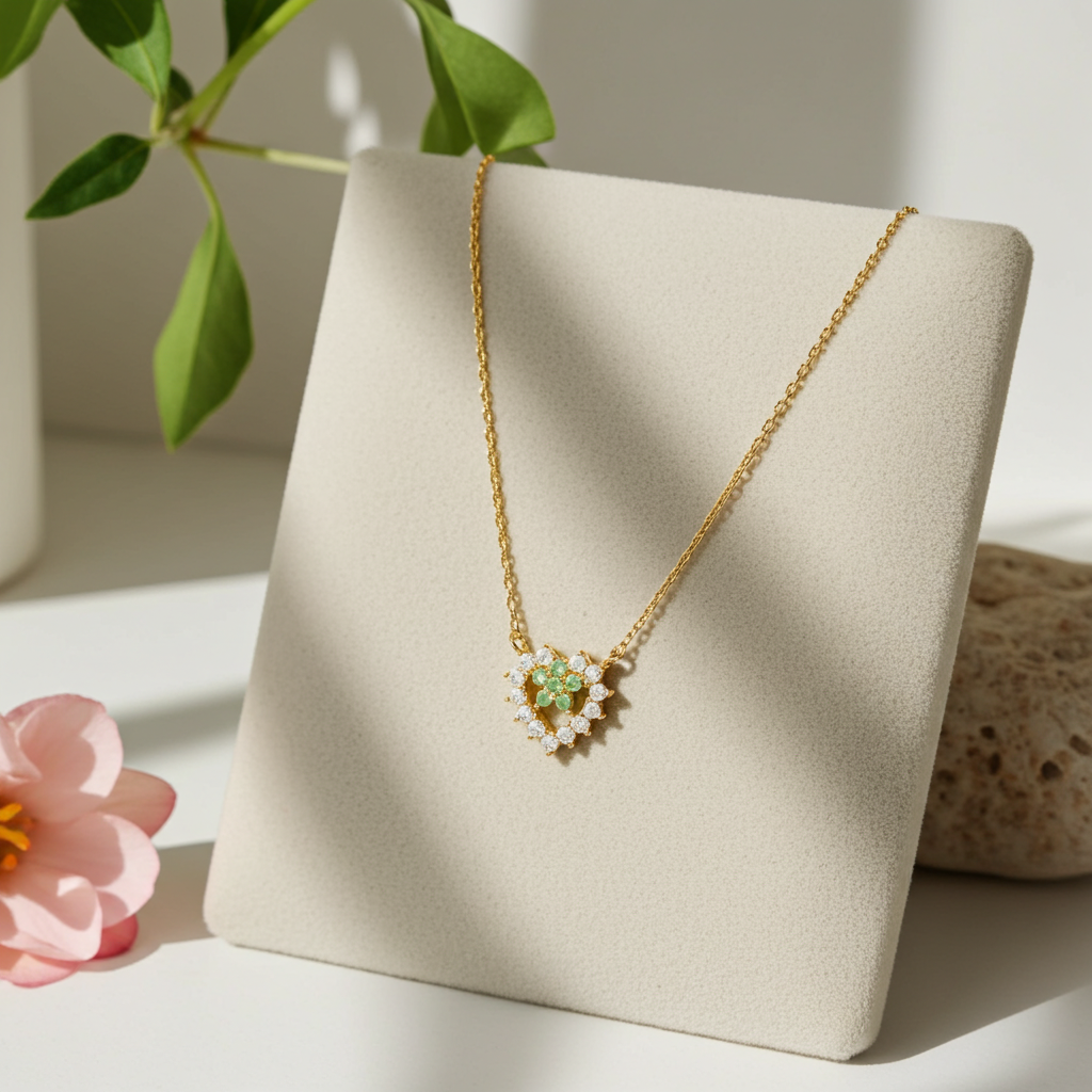 This necklace showcases a timeless gold dipped cubic zirconia flower heart pendant style. Indulge in the allure of exquisite craftsmanship as this necklace effortlessly adds a touch of luxury to your attire.