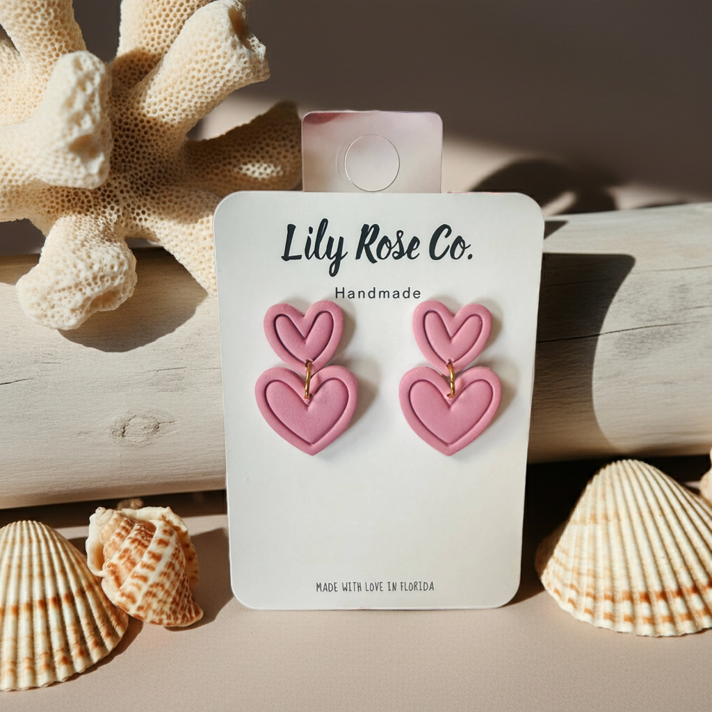 Handcrafted polymer clay earrings featuring a charming double heart design, perfect for Valentine's Day or everyday wear. Each pair is uniquely made with stainless steel hypoallergenic posts, ensuring comfort for sensitive ears. As handmade pieces, slight variations between pairs and minor imperfections are natural and add to their artisanal appeal. To preserve your earrings, avoid contact with fragrance and chemicals, keep away from direct sunlight, and store in a jewelry box or bag. Clean gently with a lightly damp cloth—never submerge in water.