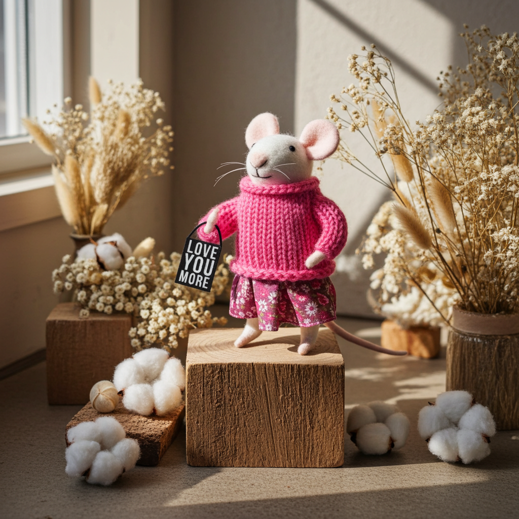 A felt critter lending a "Love You More" sentiment with knit sweater and skirt details with a clear filament hanger for easy decorating. Great to display with other critter styles or gift to a collector!