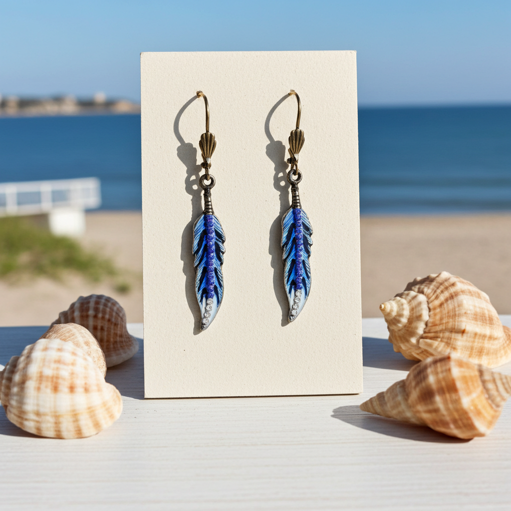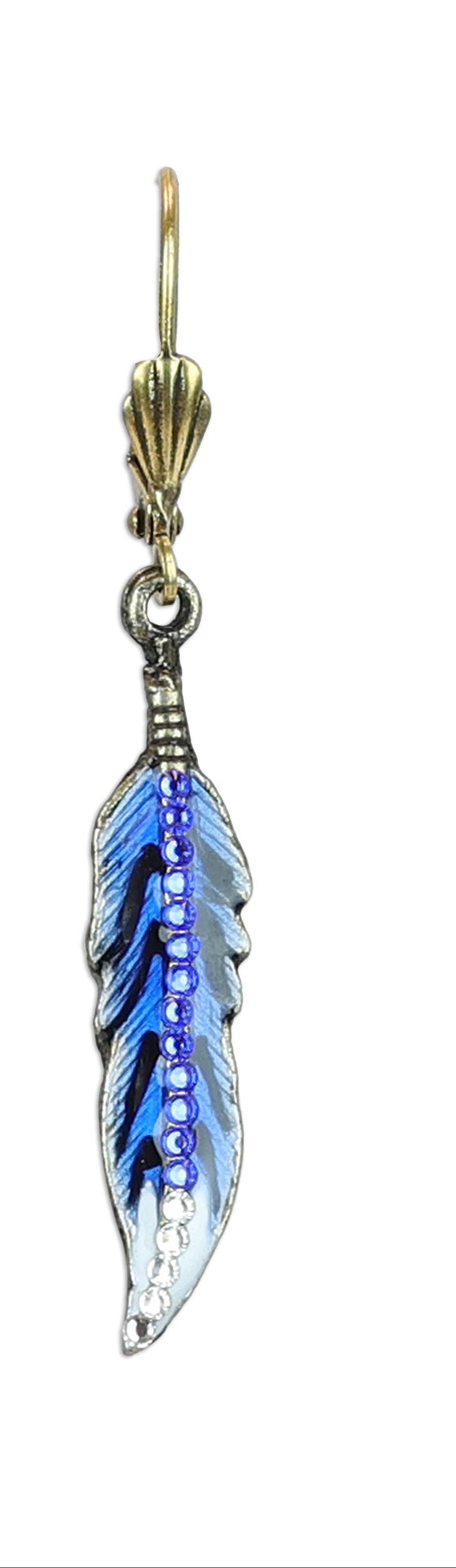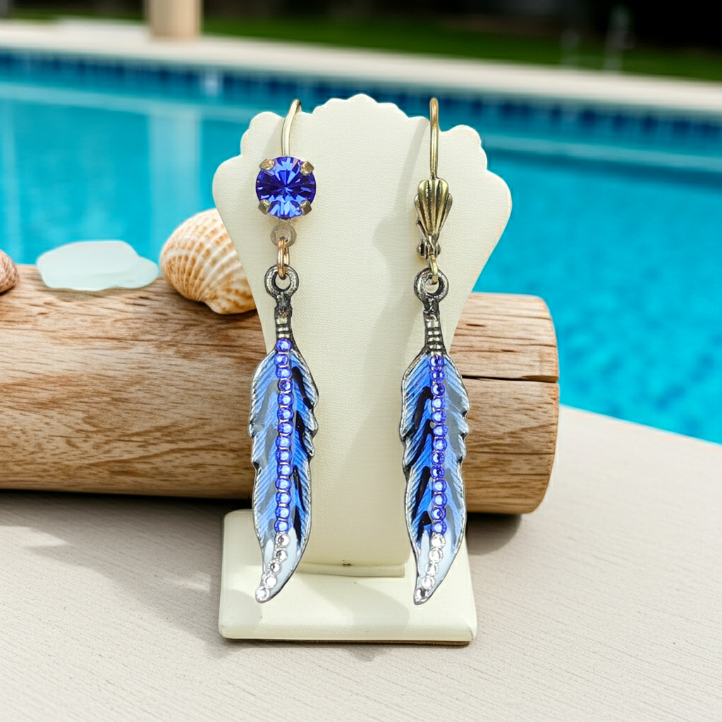 These Blue Jay feather earrings are hand painted replicas adorned with an encrusted crystal center.