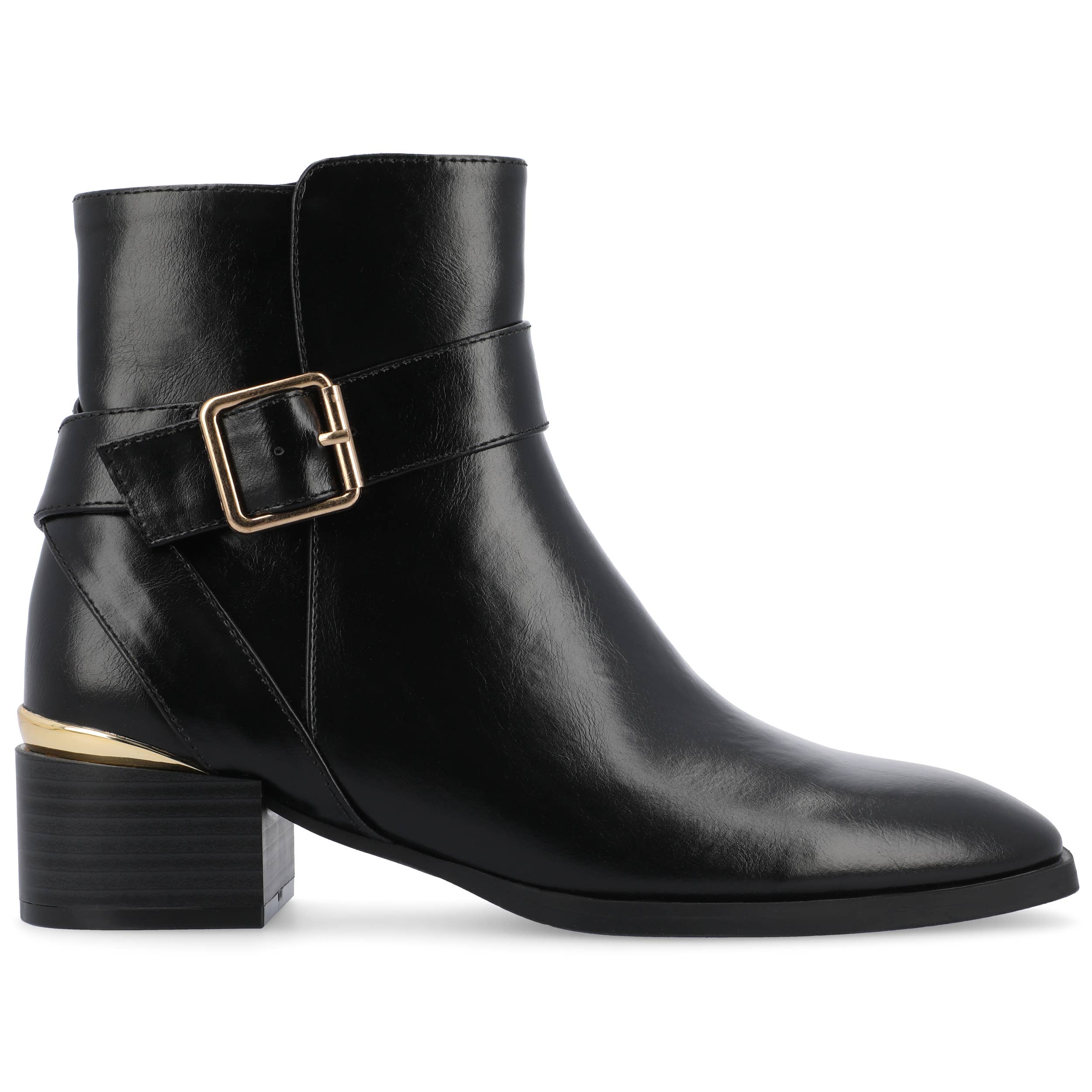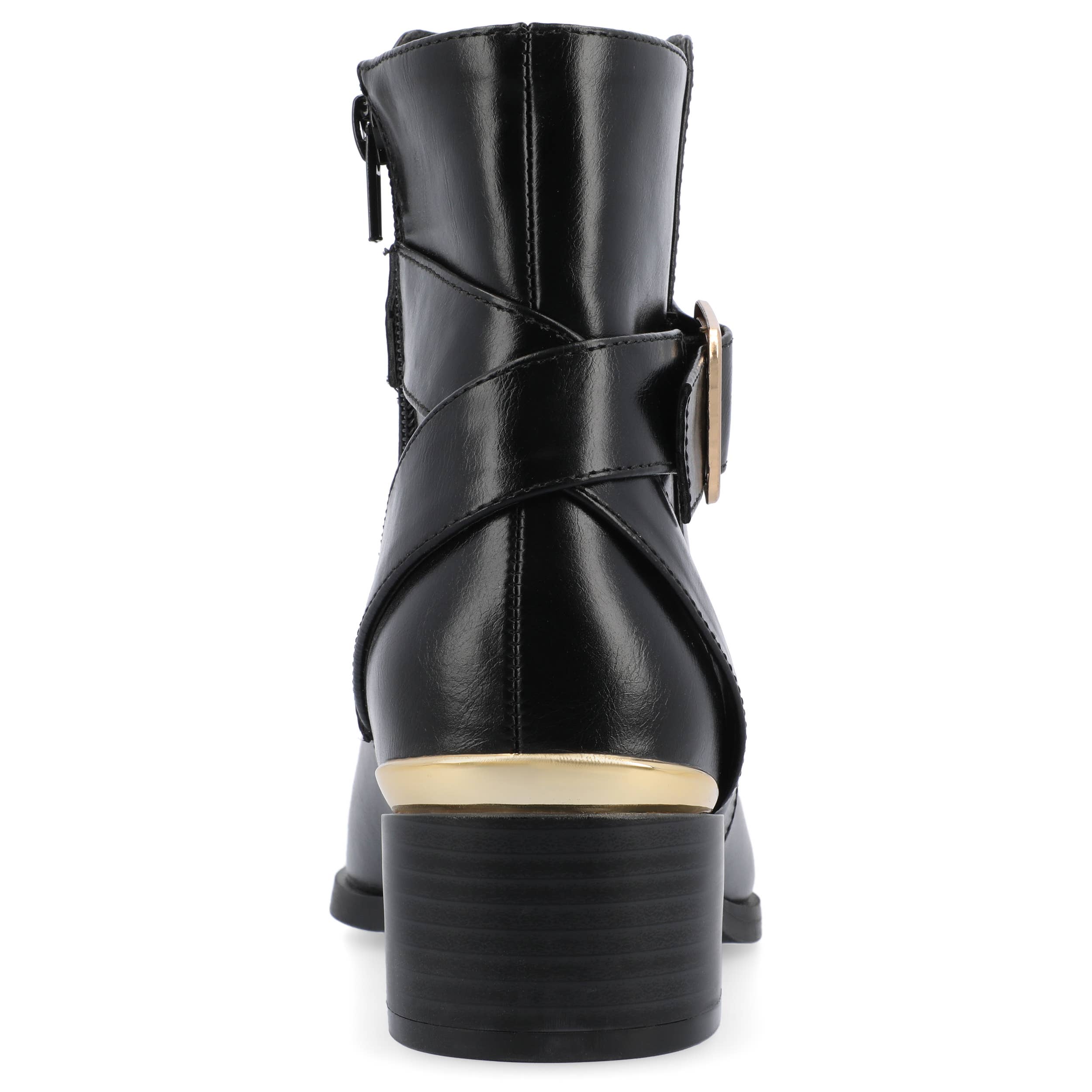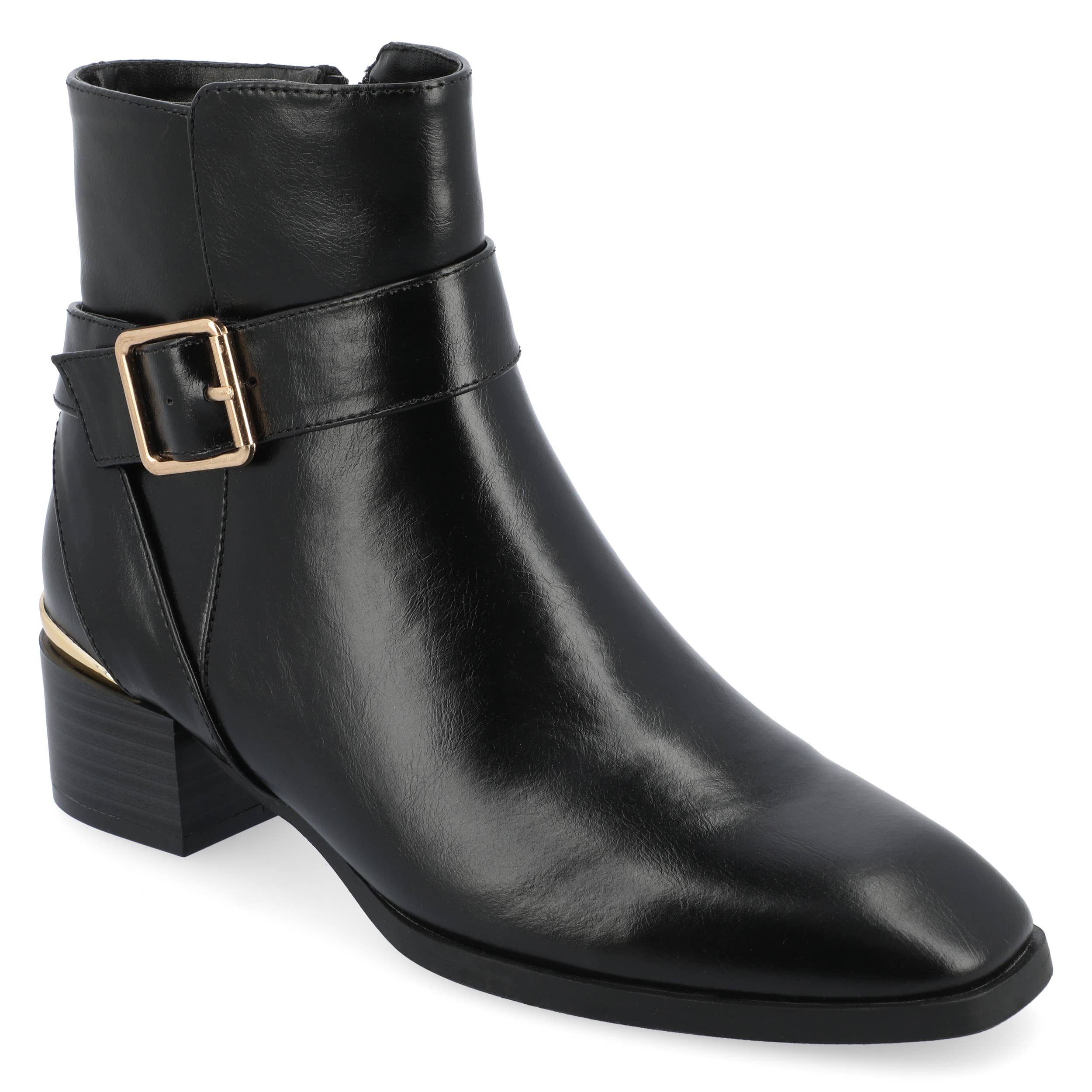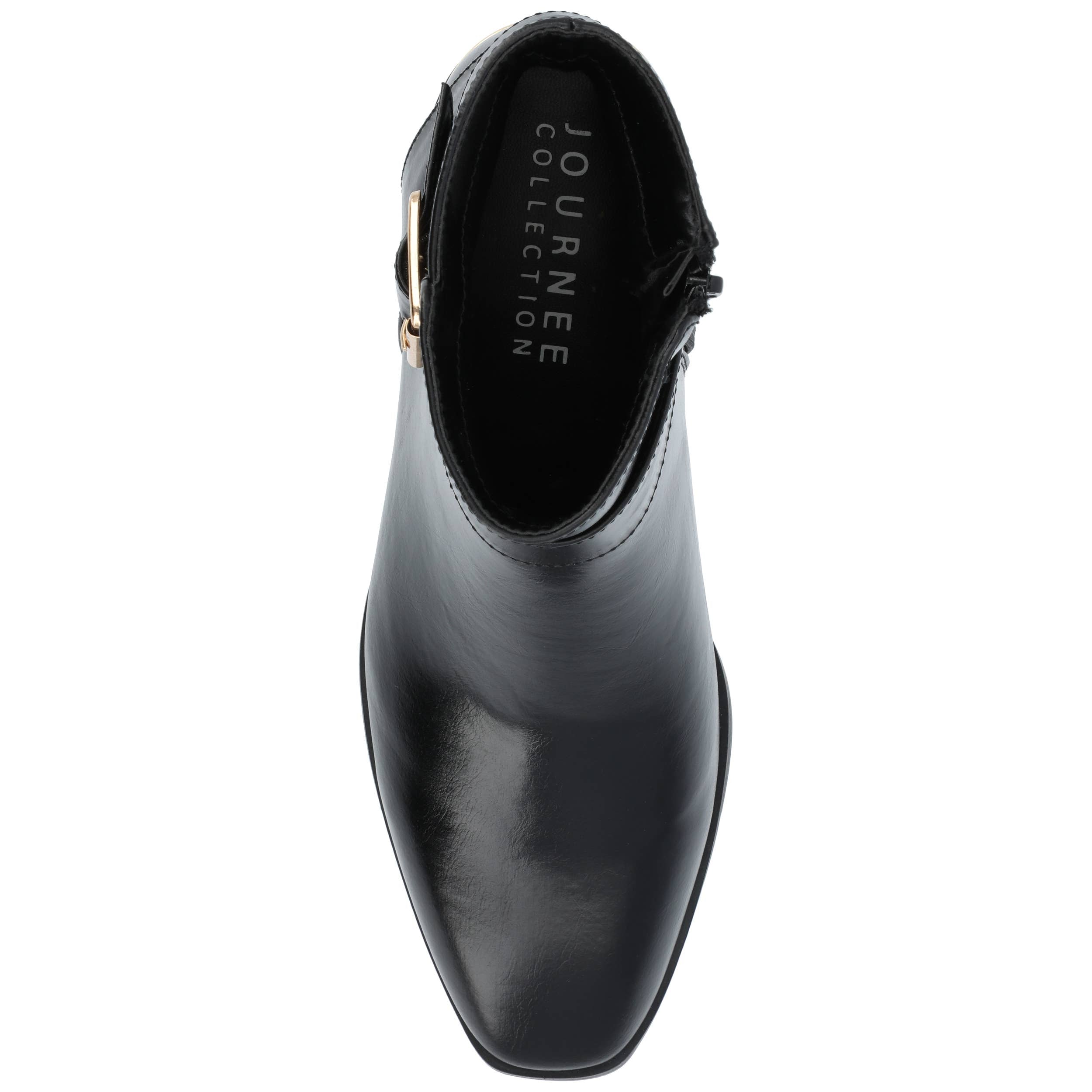 Introducing Elley, the timeless and equestrian-inspired ankle bootie from Journee Collection. Made from luxe vegan leather with a low 1 1/2 in stacked block heel, metal trim detail, strap with a buckle accent, and square-toe, Elley is perfect for any occasion. Featuring an inside zipper and 4 mm Tru Comfort Foam™ insole, Elley ensures a comfortable fit all day long, making it the perfect addition to any shoe collection. ♥Heel Height:1 1/2-inch ♥Heel Type: Stacked ♥Platform Height:Flat-inch ♥Shaft Height:5 inches ♥Top Circumference:10 1/2 inches ♥Shoe Width: Medium ♥Closure Type: Inside Zip ♥Toe Style: Square ♥Lining: Fabric ♥Upper Material: Vegan Leather ♥Outersole Material: Man-made ♥Footbed: 4 MM Tru Comfort Foam™ All measurements are approximate and were taken using a size 6. Please note measurements may vary slightly by size.