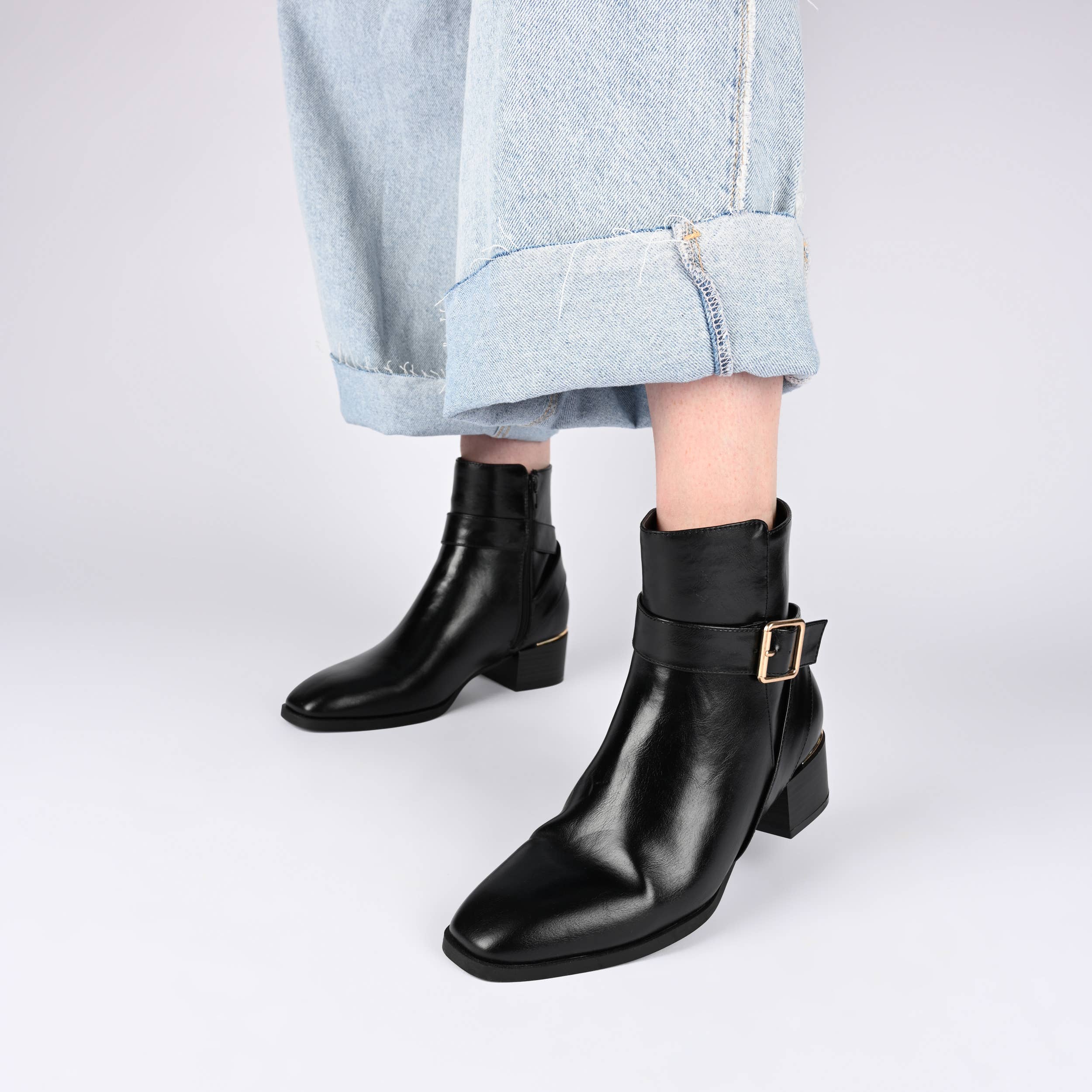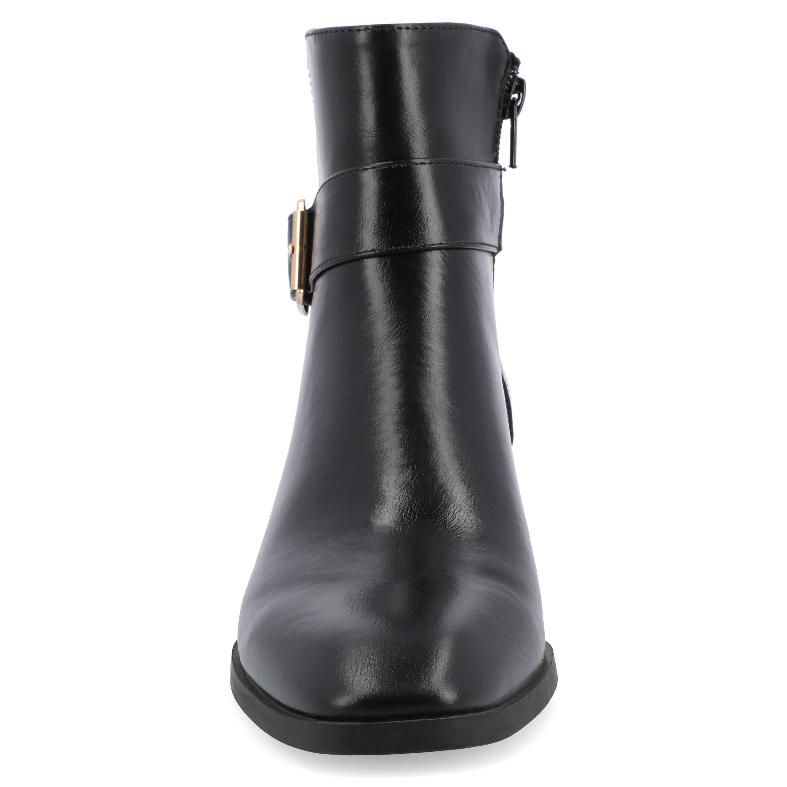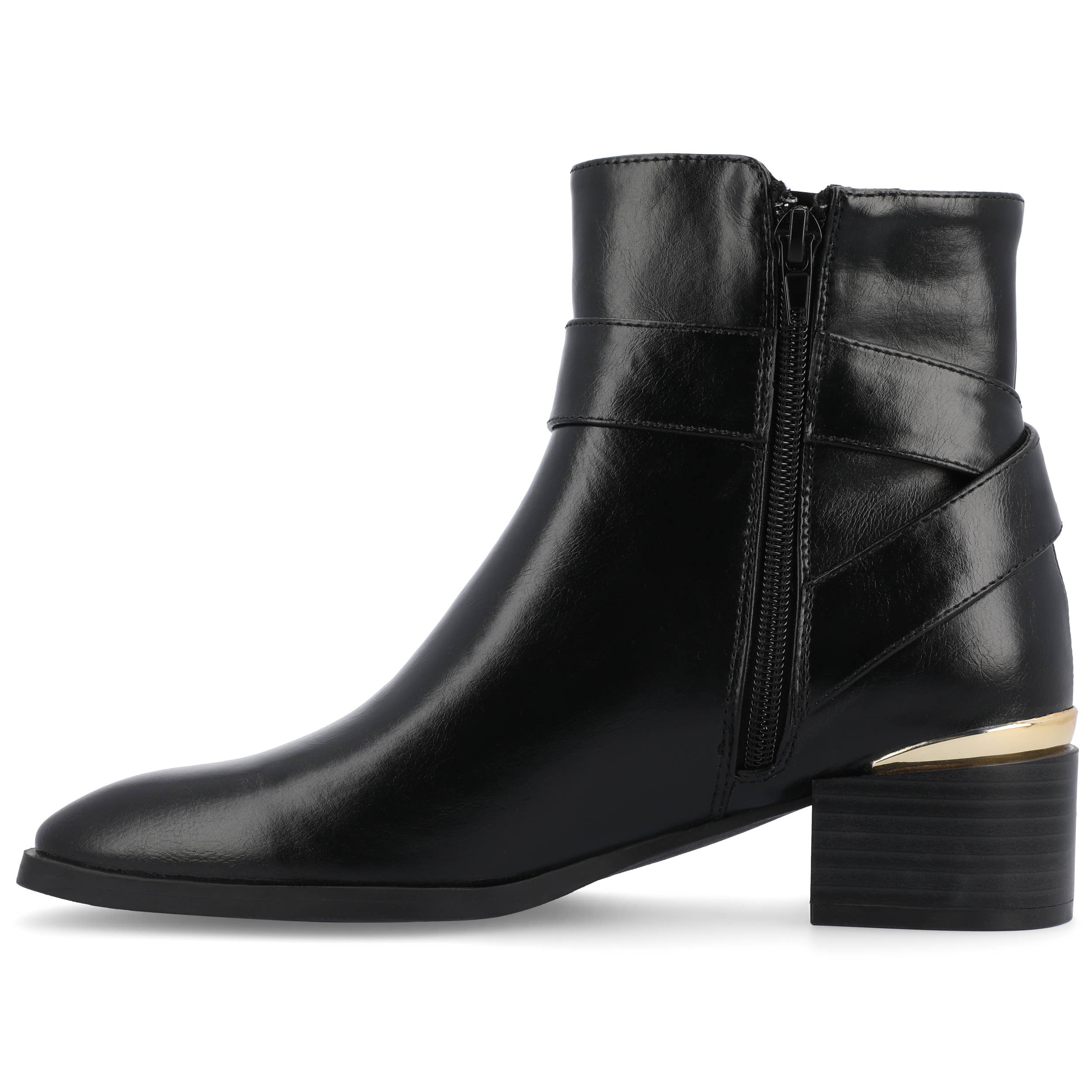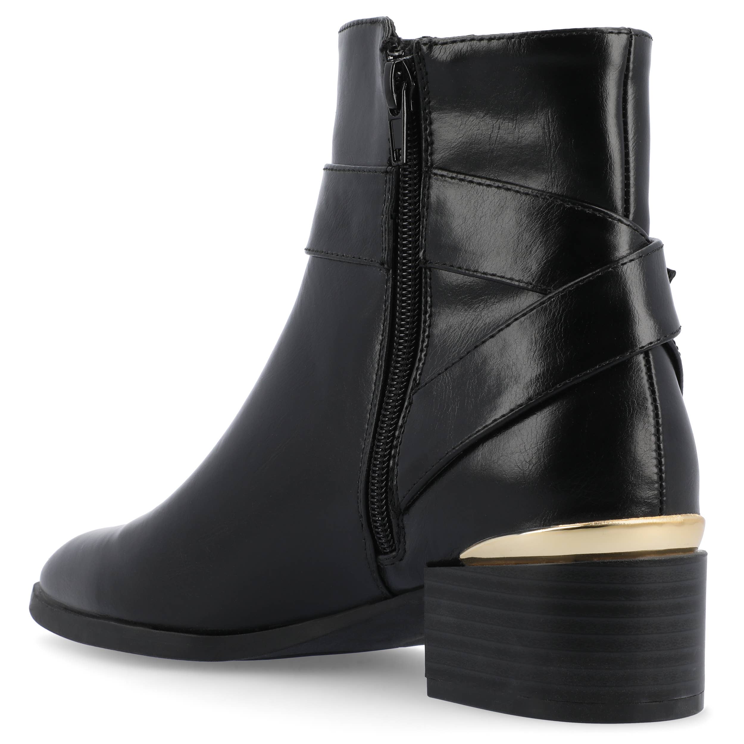 Introducing Elley, the timeless and equestrian-inspired ankle bootie from Journee Collection. Made from luxe vegan leather with a low 1 1/2 in stacked block heel, metal trim detail, strap with a buckle accent, and square-toe, Elley is perfect for any occasion. Featuring an inside zipper and 4 mm Tru Comfort Foam™ insole, Elley ensures a comfortable fit all day long, making it the perfect addition to any shoe collection. ♥Heel Height:1 1/2-inch ♥Heel Type: Stacked ♥Platform Height:Flat-inch ♥Shaft Height:5 inches ♥Top Circumference:10 1/2 inches ♥Shoe Width: Medium ♥Closure Type: Inside Zip ♥Toe Style: Square ♥Lining: Fabric ♥Upper Material: Vegan Leather ♥Outersole Material: Man-made ♥Footbed: 4 MM Tru Comfort Foam™ All measurements are approximate and were taken using a size 6. Please note measurements may vary slightly by size.
